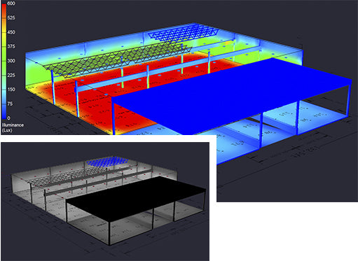 Nous déterminons l'intensité d'éclairage (en nombre de lux ou de pieds-bougies) dont vous avez besoin selon votre type d'activité. À l'aide d'un logiciel de rendu d'éclairage, nous créons une simulation de votre projet.